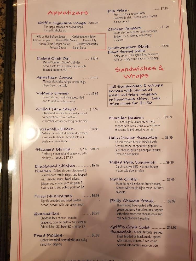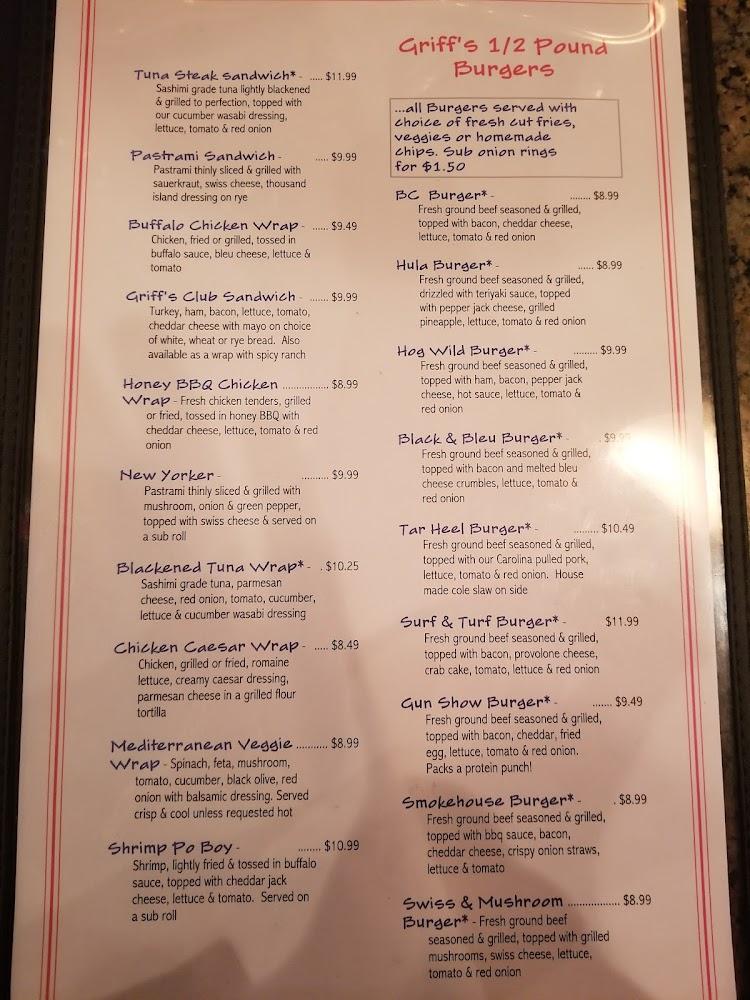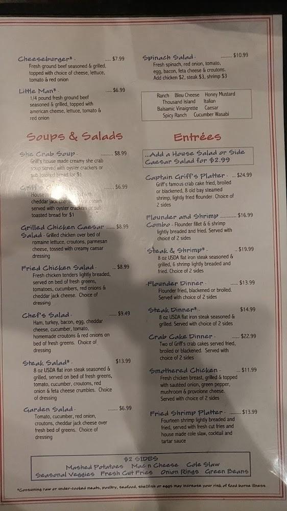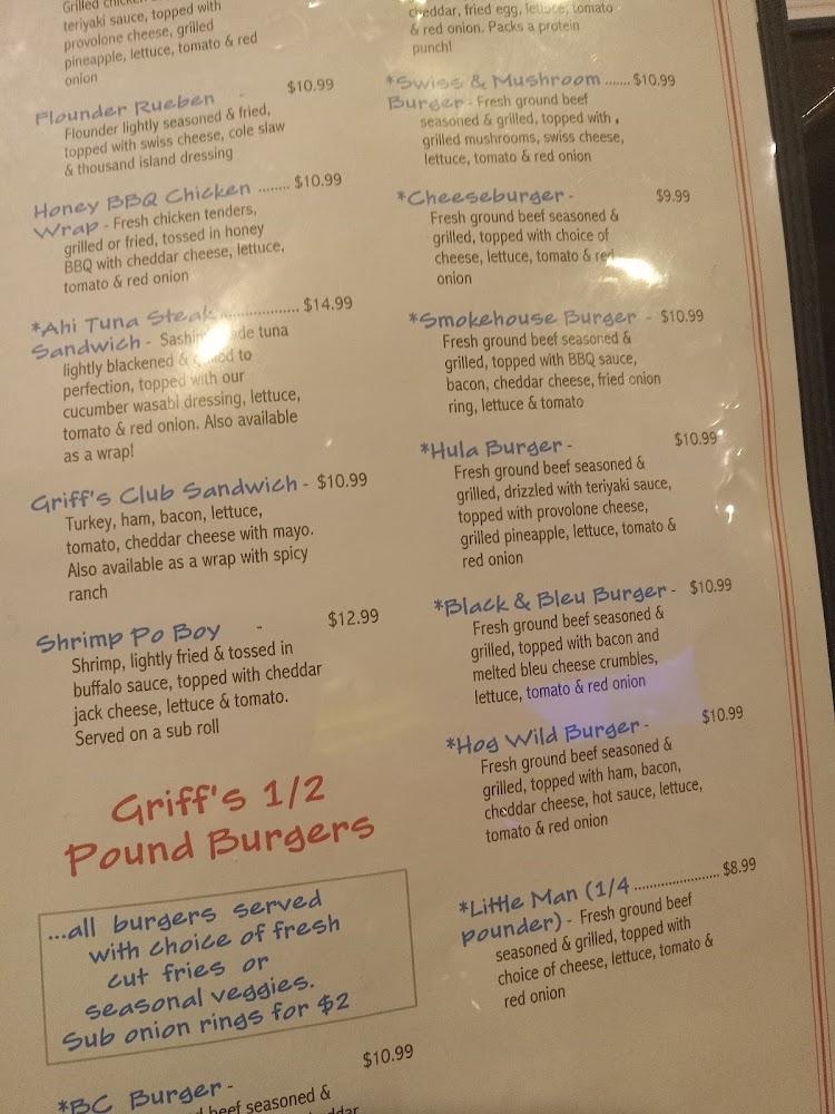 The menu at Griff's offers a range of delicious options. Burgers stand out, featuring fresh ingredients and bold flavors. Appetizers like fried shrimp and crab dip are perfect for sharing. Salads and soups cater to lighter appetites. There’s also a dedicated kids' menu, ensuring families feel welcome. Prices are affordable, averaging around $11, making it easy to indulge. Happy hour brings even better deals on food and drinks, adding to the appeal.